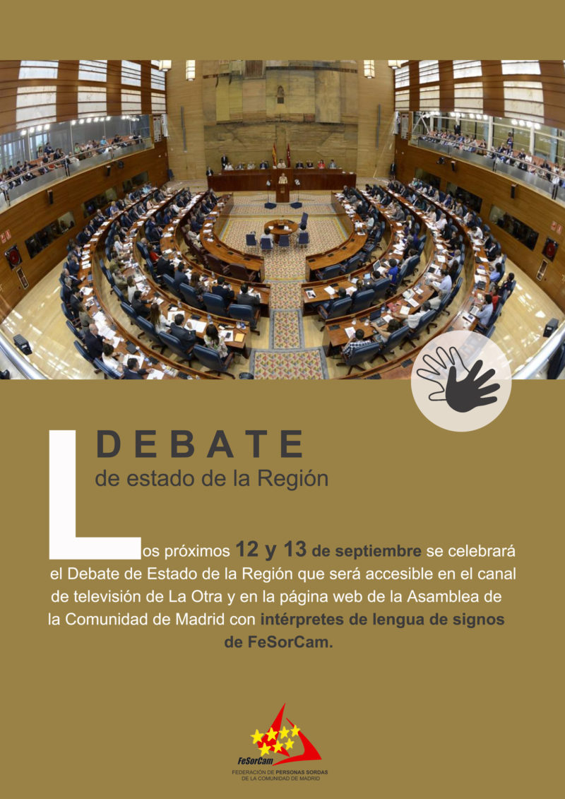 Los próximos 12 y 13 de septiembre se celebrará el Debate de Estado de la Región que será accesible en el canal de televisión de La Otra y en la página web de la Asamblea de la Comunidad de Madrid con intérpretes de lengua de signos de FeSorCam.